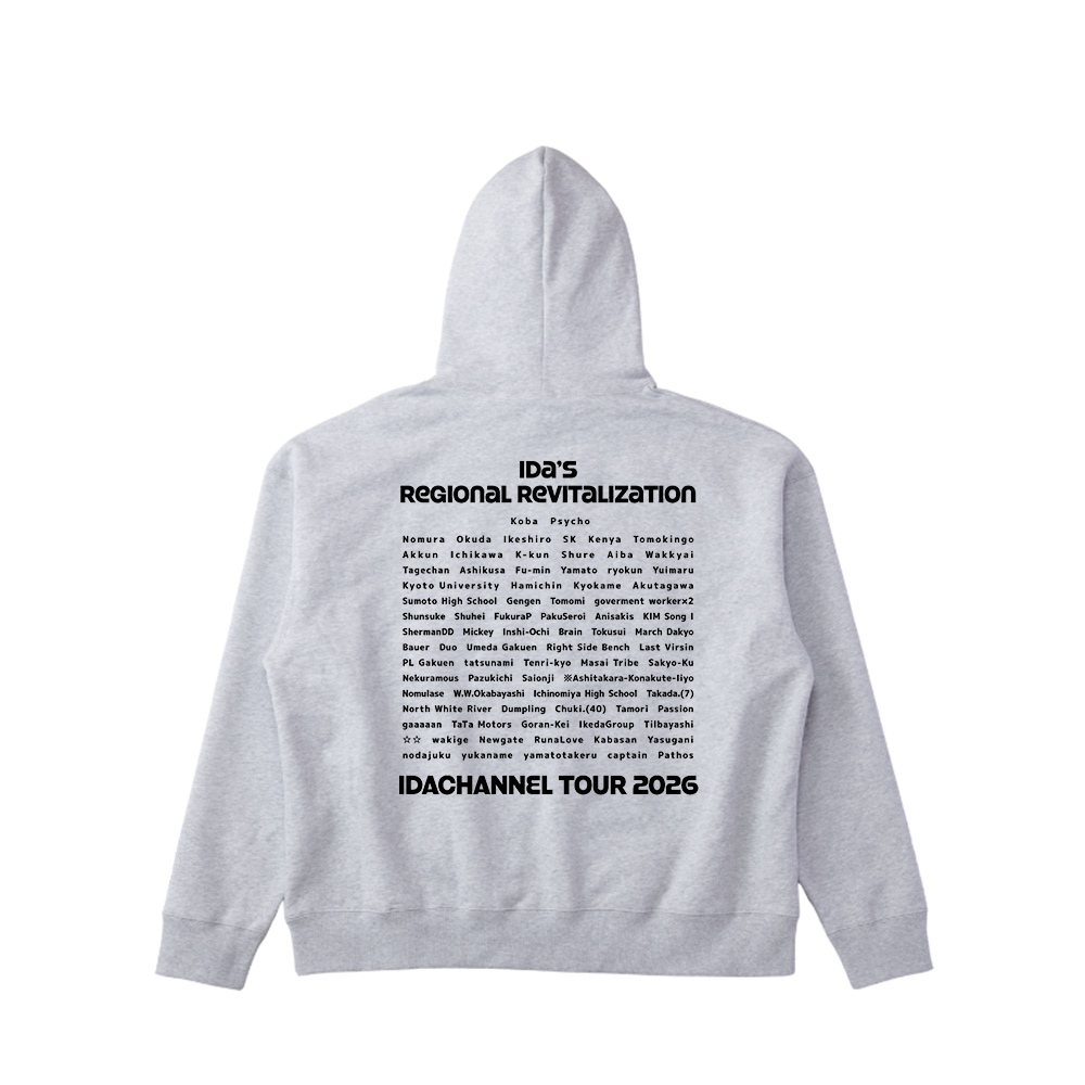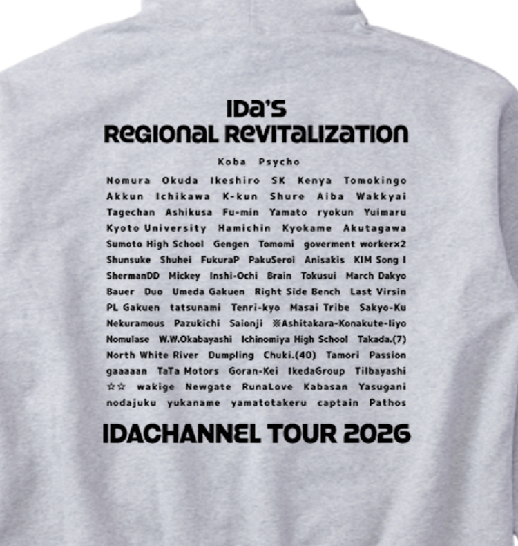 フロントにはツアーロゴを、バックにはこれまでの「いだちゃんねる」に縁のある名前や言葉をプリントしています。