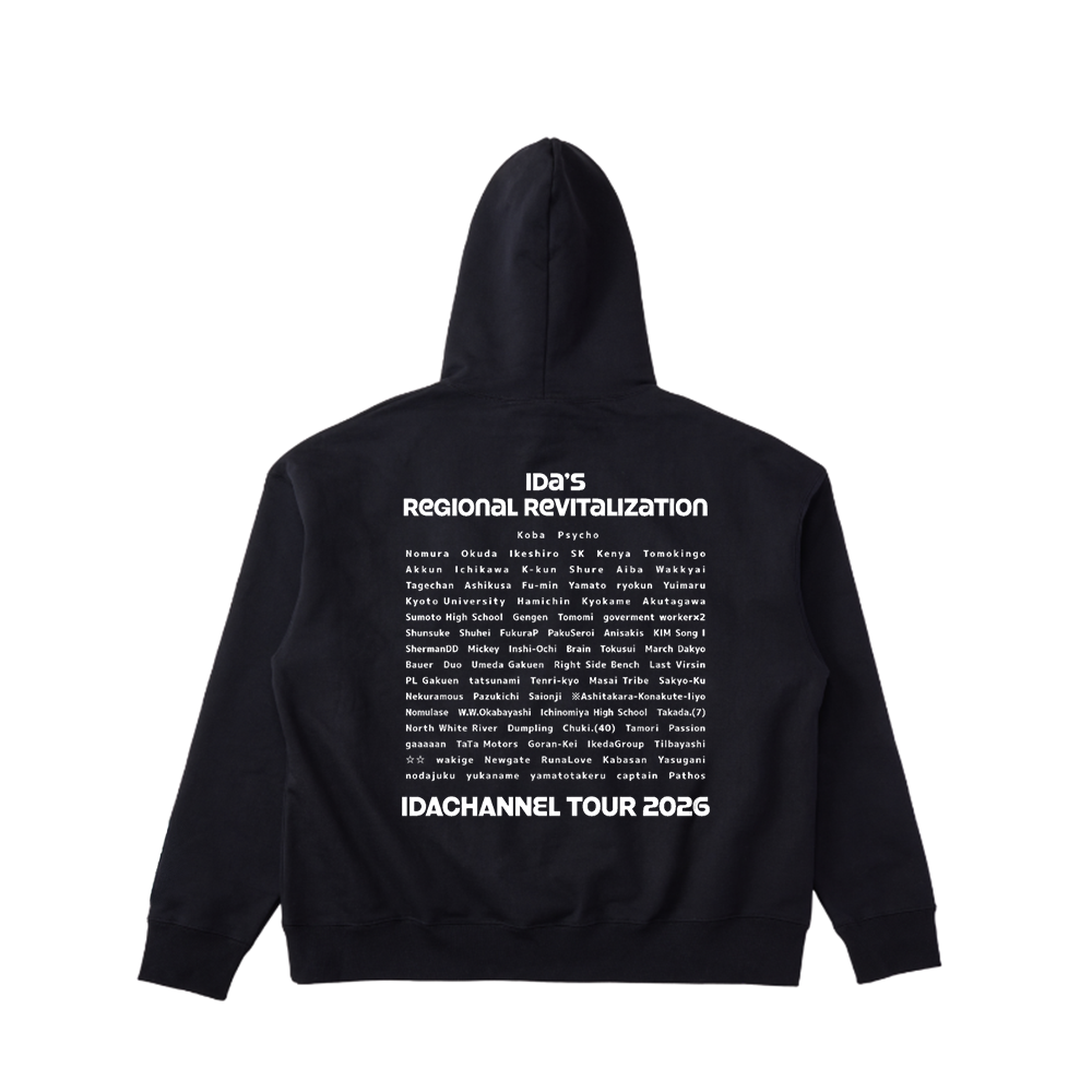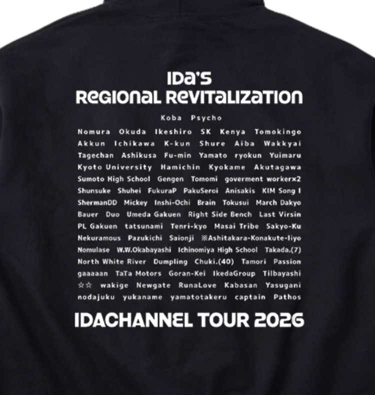 フロントにはツアーロゴを、バックにはこれまでの「いだちゃんねる」に縁のある名前や言葉をプリントしています。